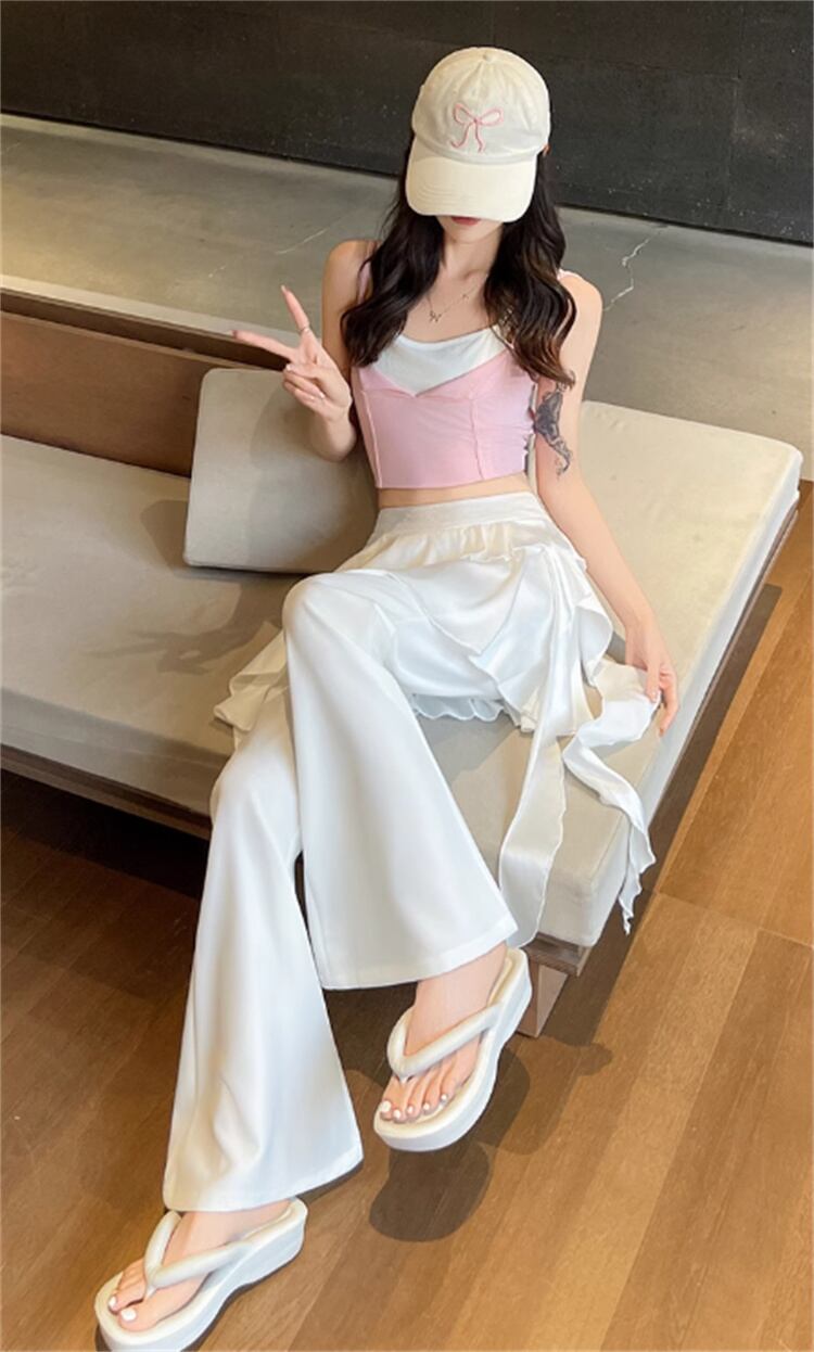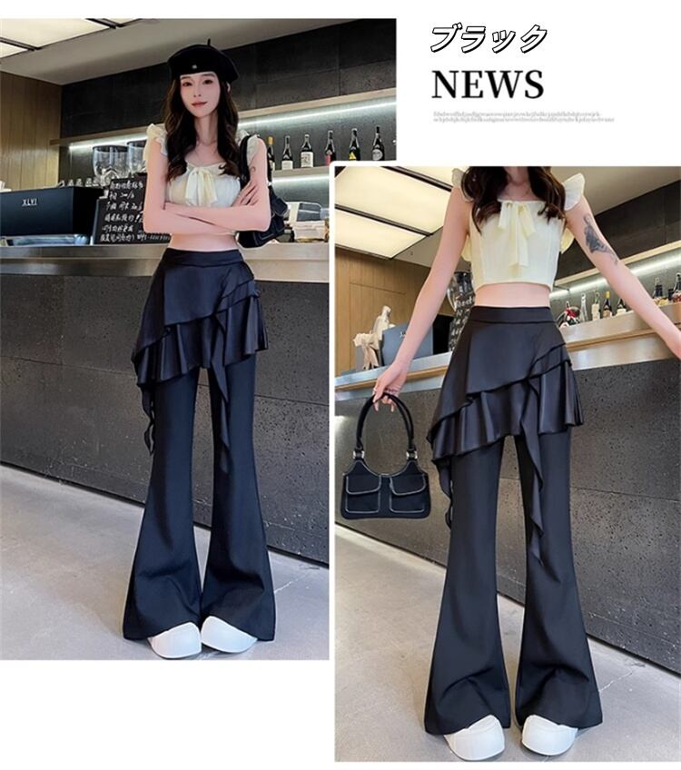 見せかけツーウェイ フレアパンツ フリル裾 ゴムベルトハイウエスト 夏向けロングパンツ