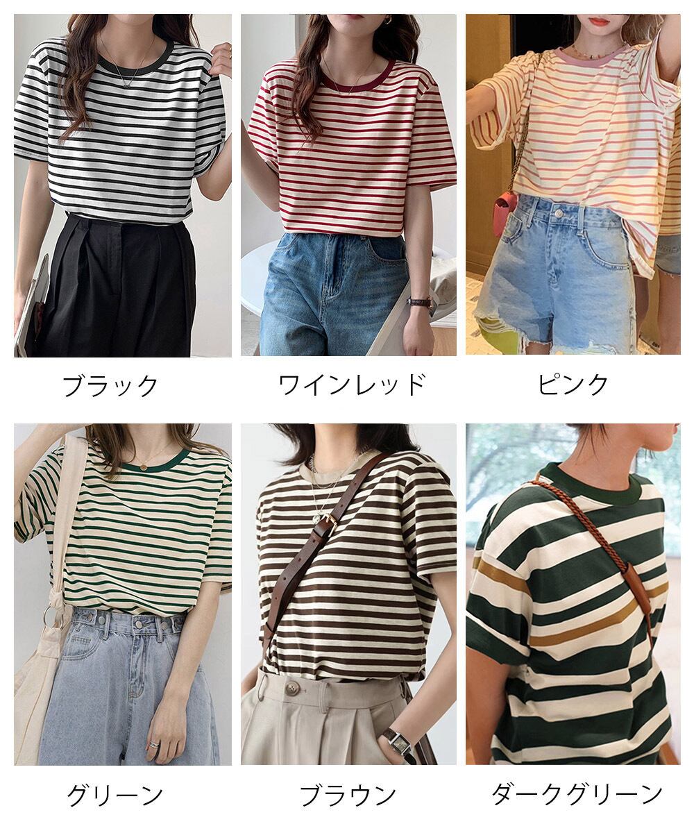 涼しいボーダートップス おしゃれ夏服 着やせ ラウンドネックTシャツ 配色プルオーバー 薄手カットソーカジュアルきれいめ