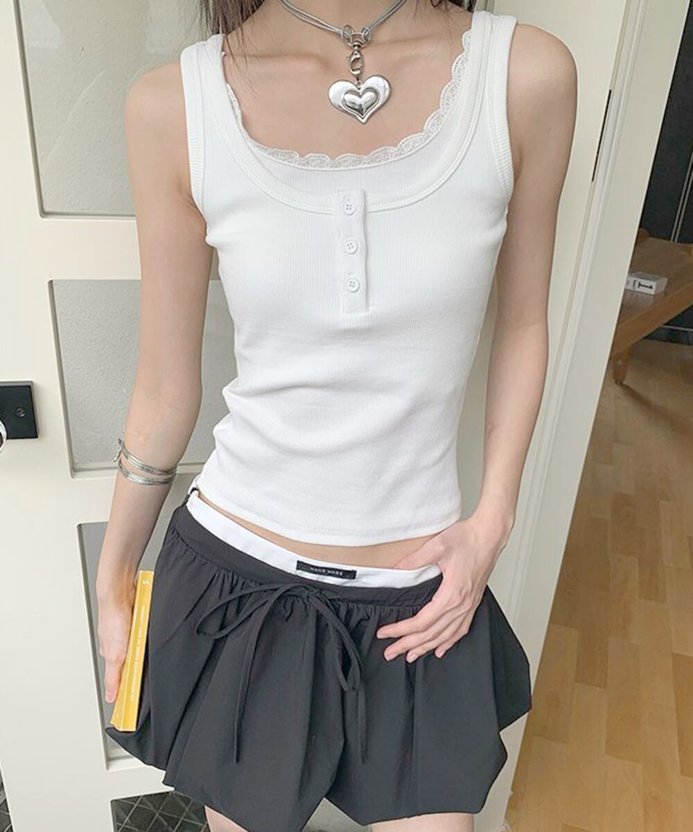 レース付き リブタンクトップ 大人カジュアル ノースリーブ夏服 カットソー 可愛い肌着 フィット 着回しインナートップス