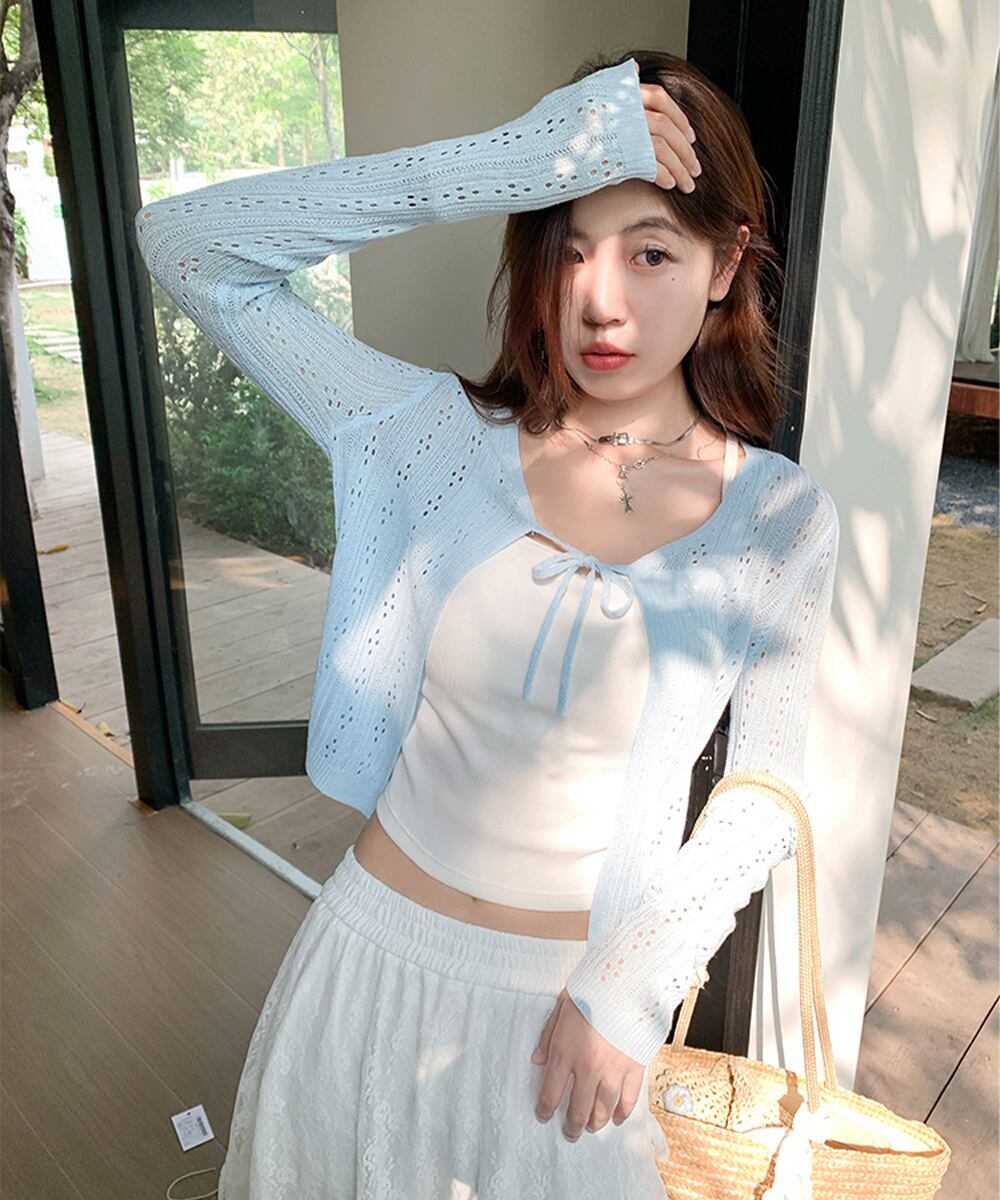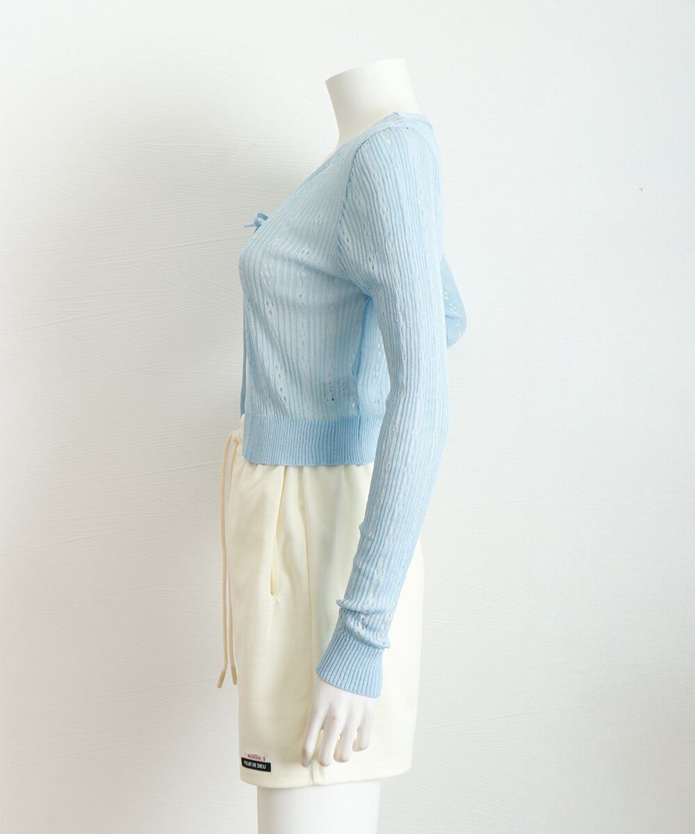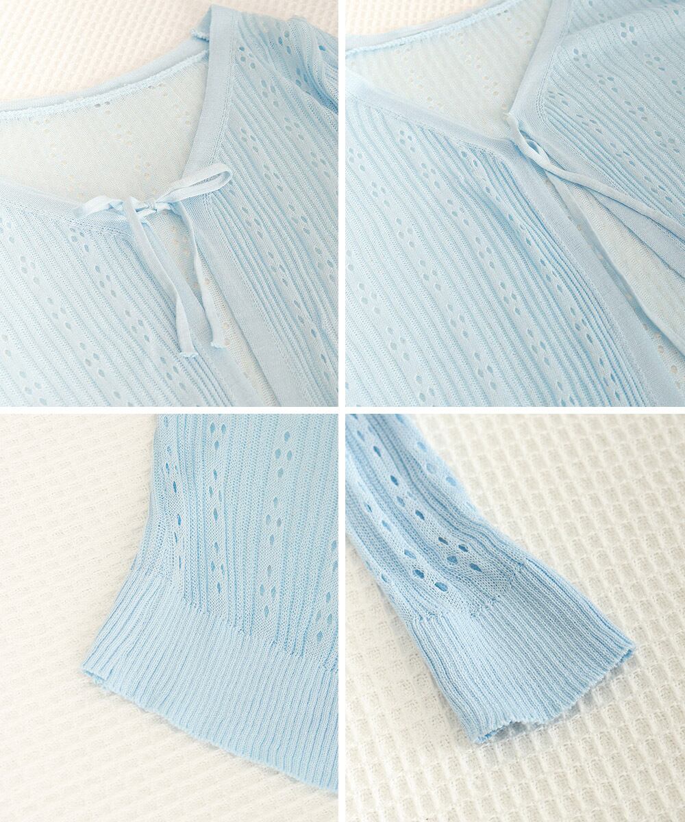 フロントはリボン結びで、通気性のある透かし編みデザイン。