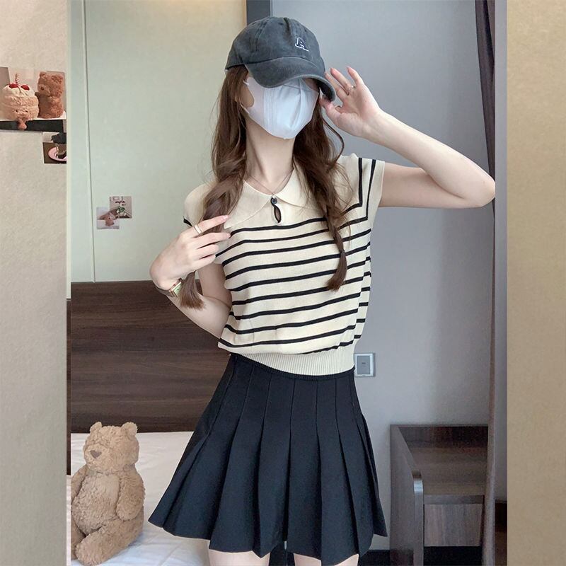 ボーダー柄 ノースリーブ ニット トップス 襟付き ショート ショート丈 袖なし
