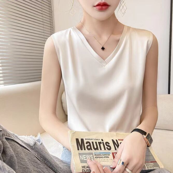 レディース サテンタンクトップ ノースリーブ インナー Vネック