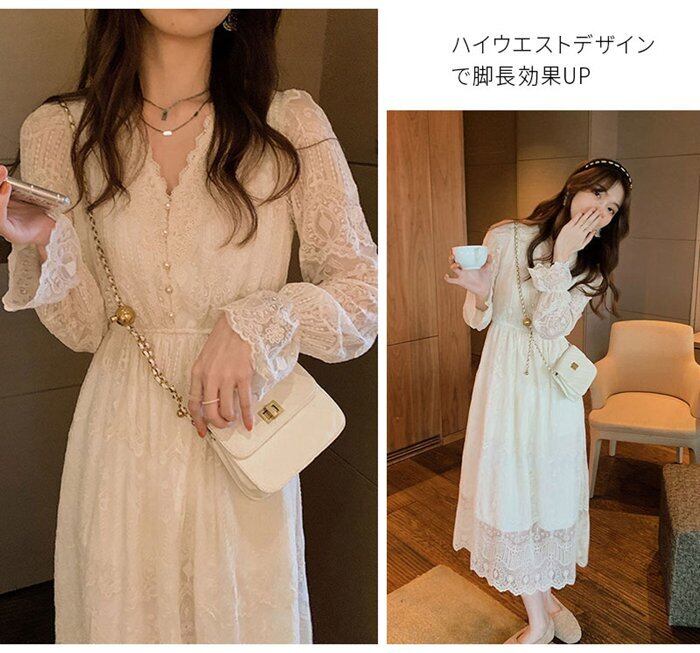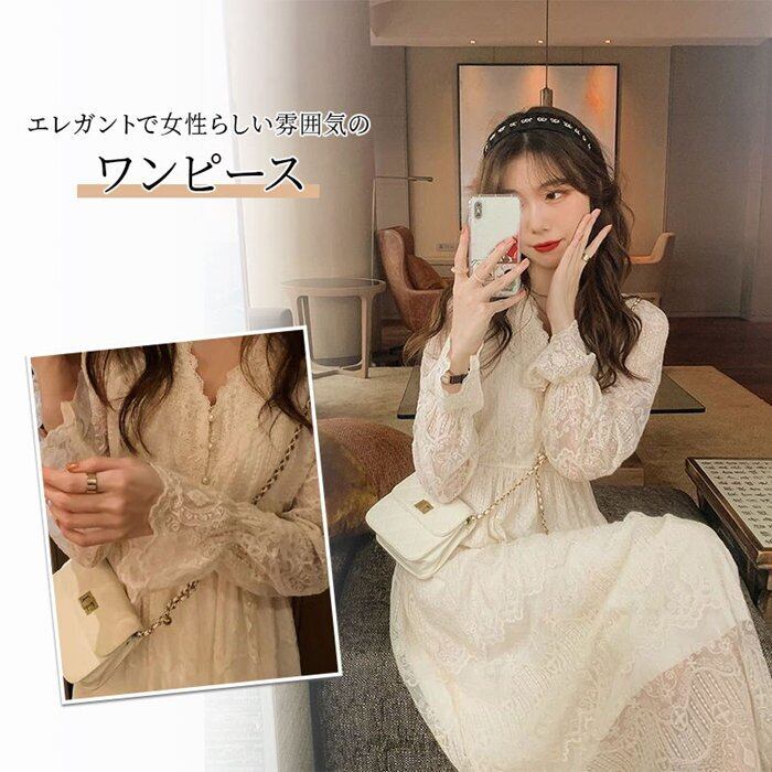 ワンピース レースワンピース ロング丈 レディース Vネット 体型カバー 長袖 シンプル カジュアル