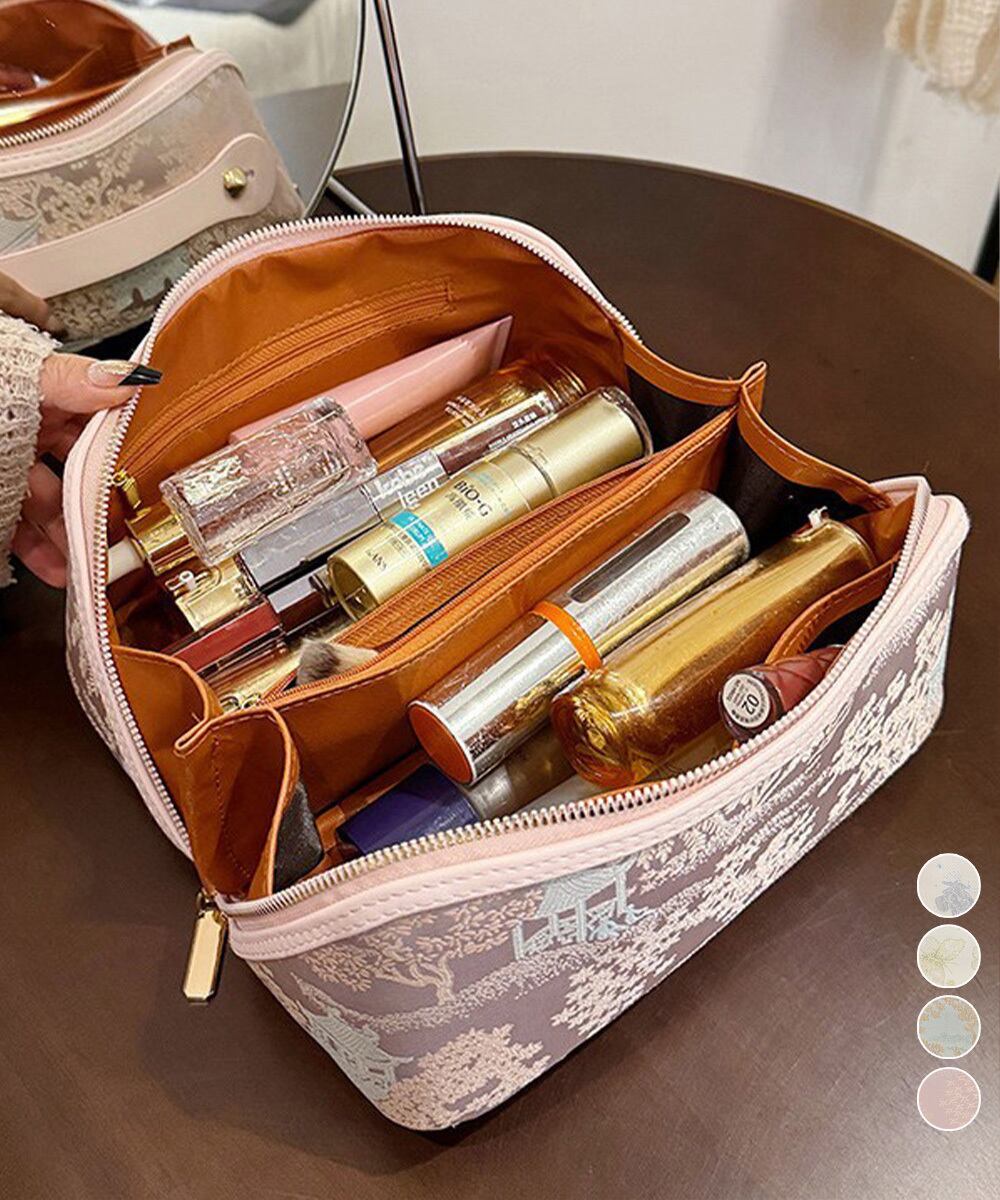 上品な刺しゅう風デザインの大容量メイクポーチ。