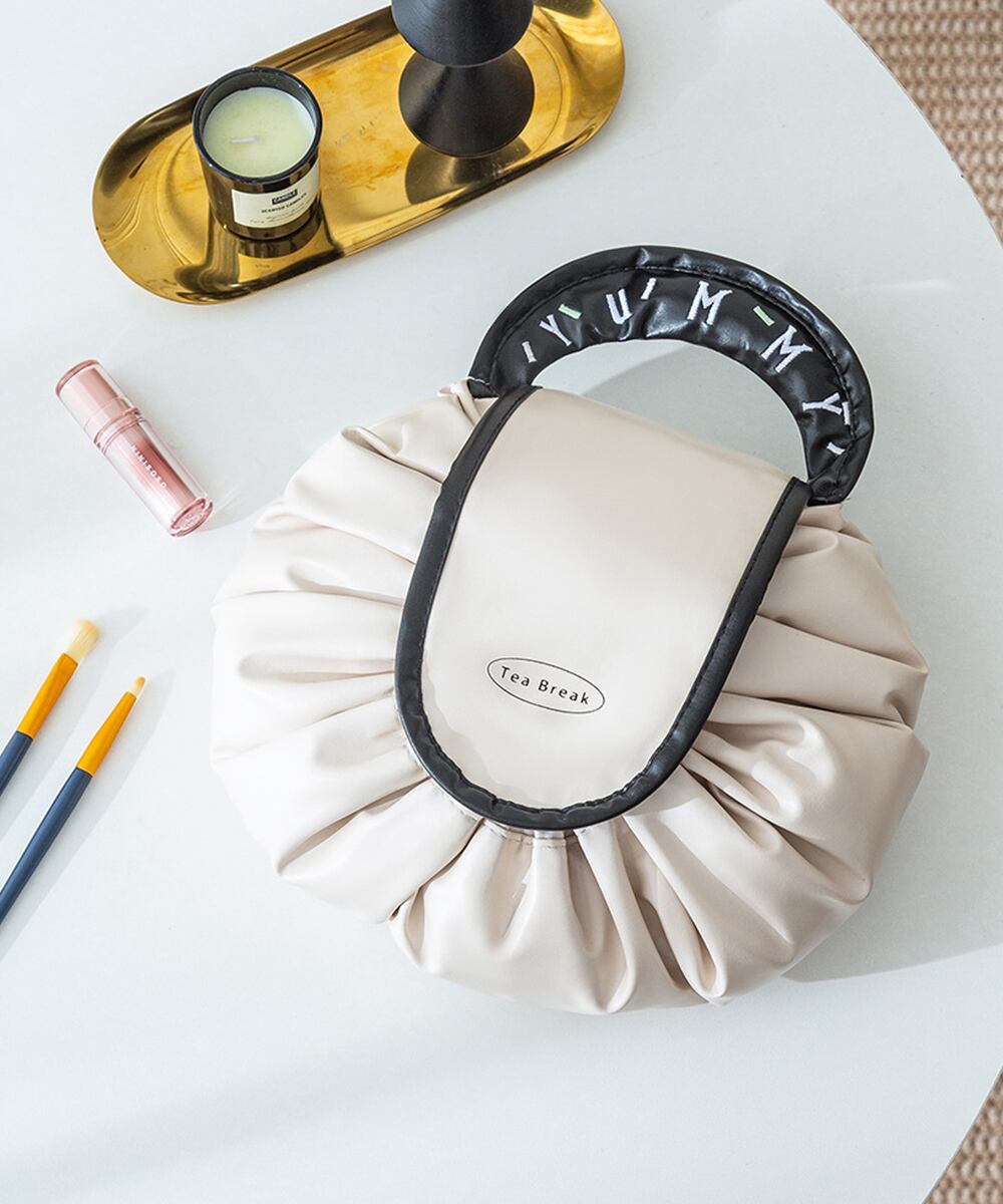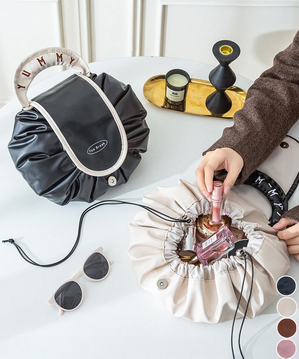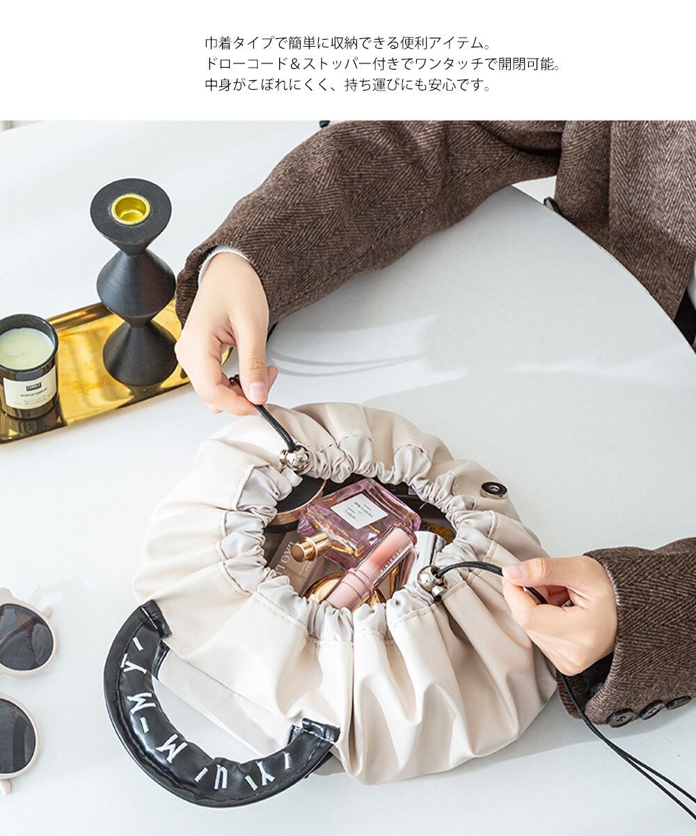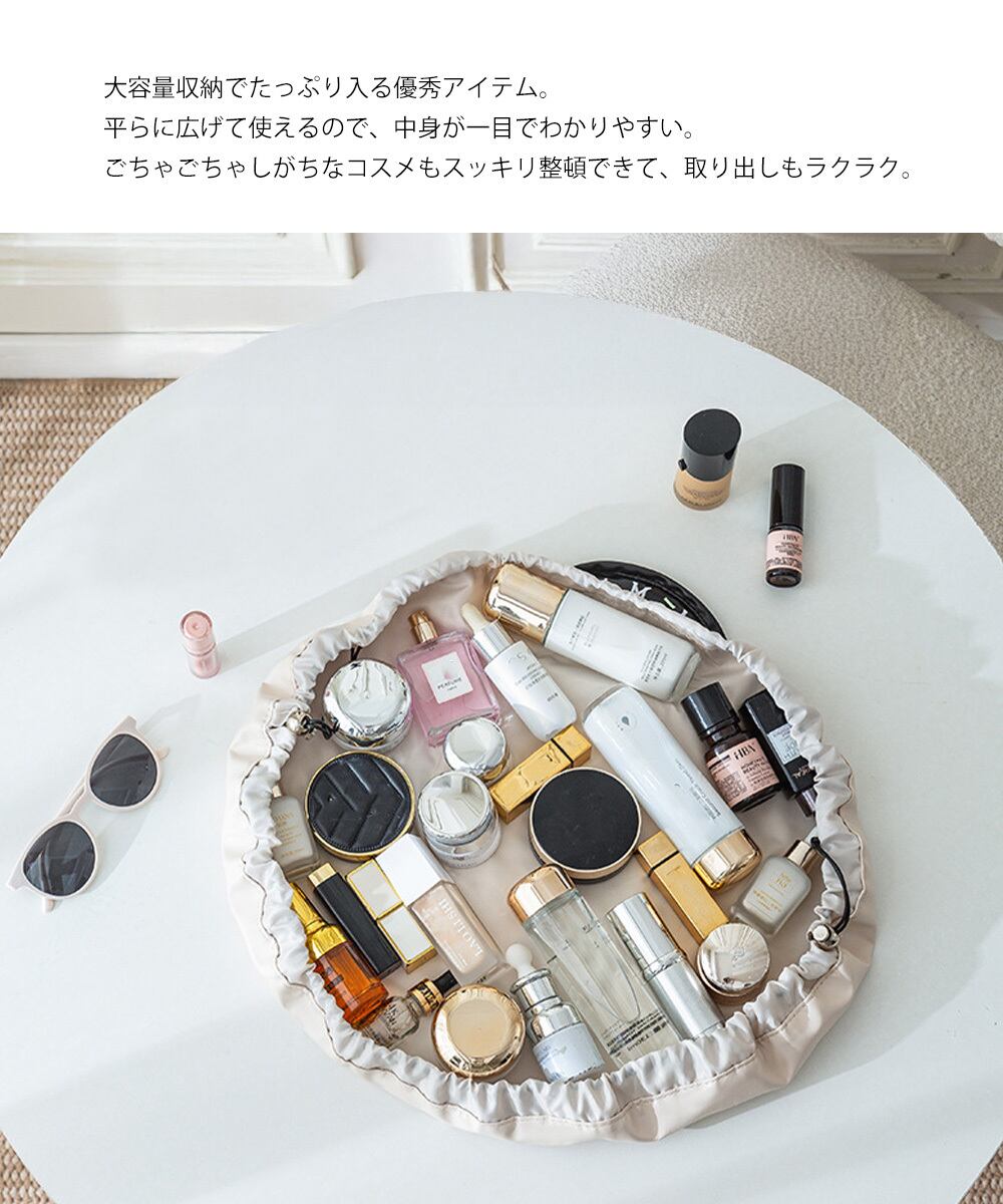 両サイドの紐をギュッと絞るだけで、コンパクトに収納できる便利な大容量の巾着型メイクポーチ。